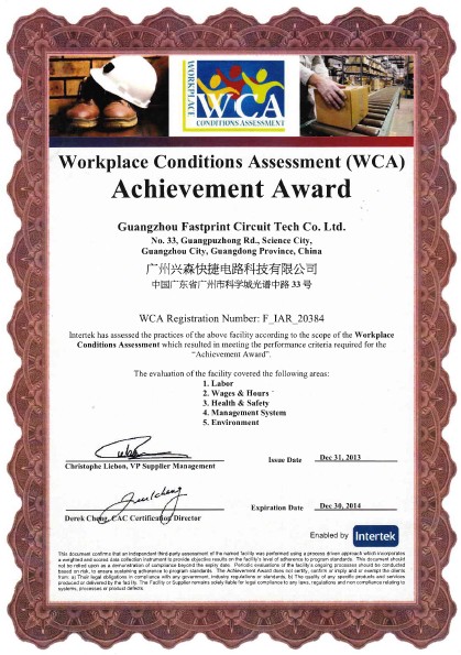 廣州興森快捷電路科技有限公司于2013年12月順利通過來自Intertek公司的Workplace Conditions Assessment (WCA 工作環(huán)境評(píng)估)審核并獲得“優(yōu)秀成就獎(jiǎng)”證書。